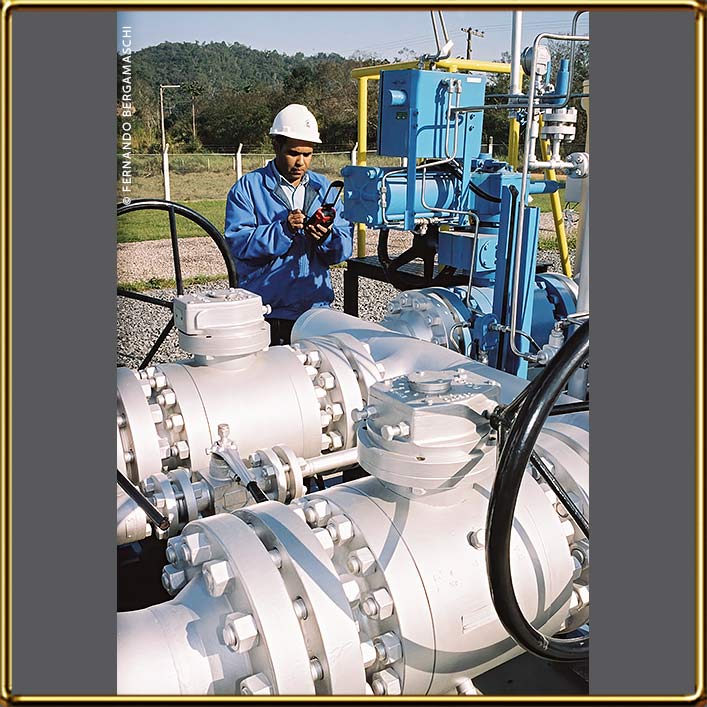 Industrial plant oil refinery, REPAR - Presidente Getúlio Vargas Refinery. Sector of metals factory of Zamprogna, Rio Grande do Sul, Brazil Technician verifying data. TBG EE Gaspar-HV 56 TBG - Transportadora Gazoduto Bolivia-Brasil obra gazoduto em Limeira São Paulo